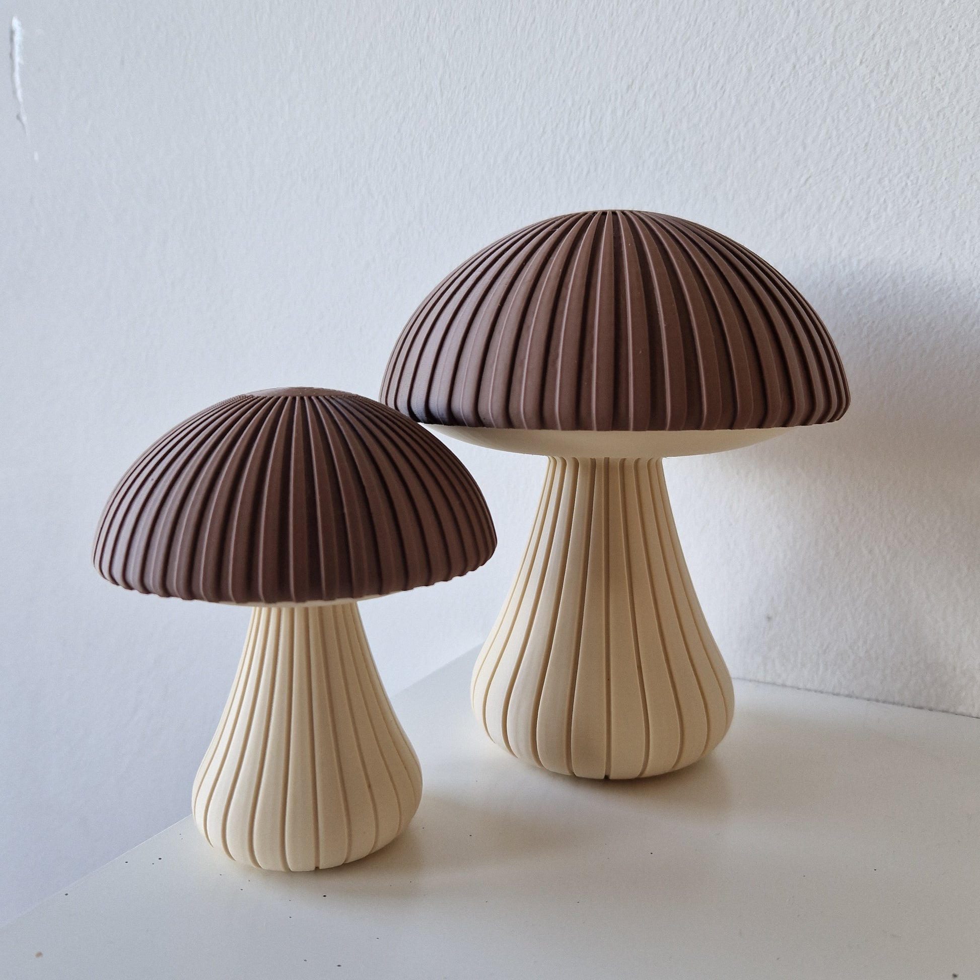 Na voljo v dveh velikostih: mala (8 cm) in velika (16,5 cm). Oblikovana z 3D tiskom, da oponaša teksturo narave — nežne valovitosti klobuka, subtilne linije, domiselna oblika. Material je lahek, a dovolj čvrst, da lepo stoji – na okenski polici, polici ob kaminu, mizi.
